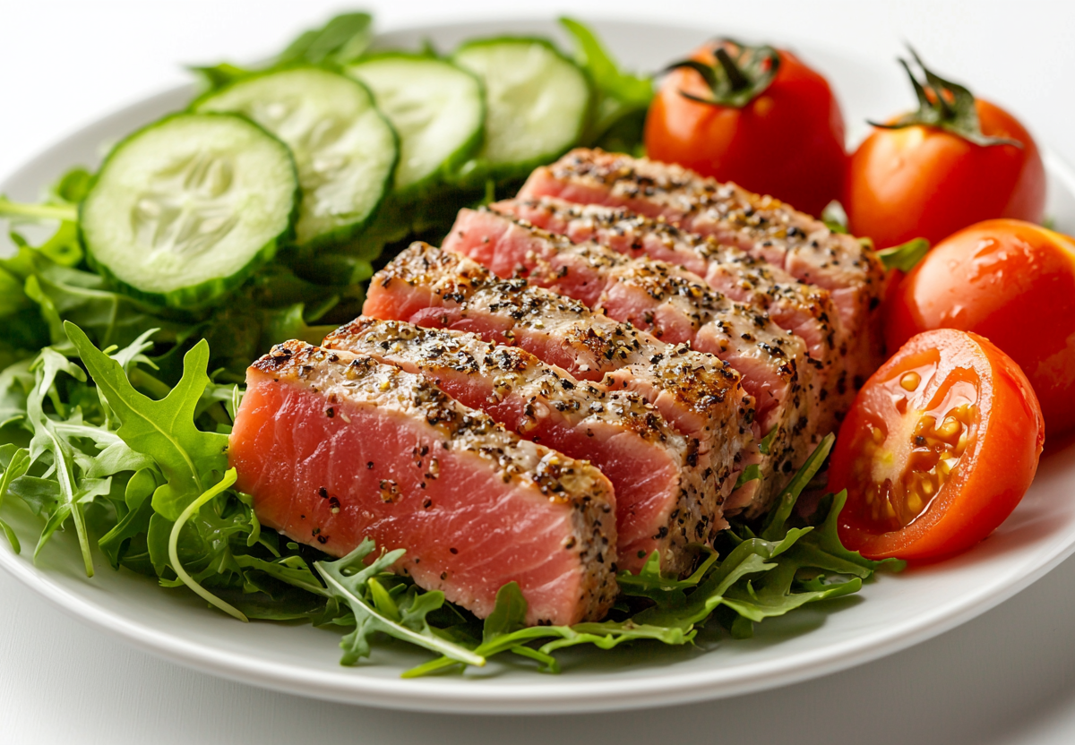 - Подача: разрежьте тунец на ломтики, выложите на овощи. Украсьте долькой лимона.