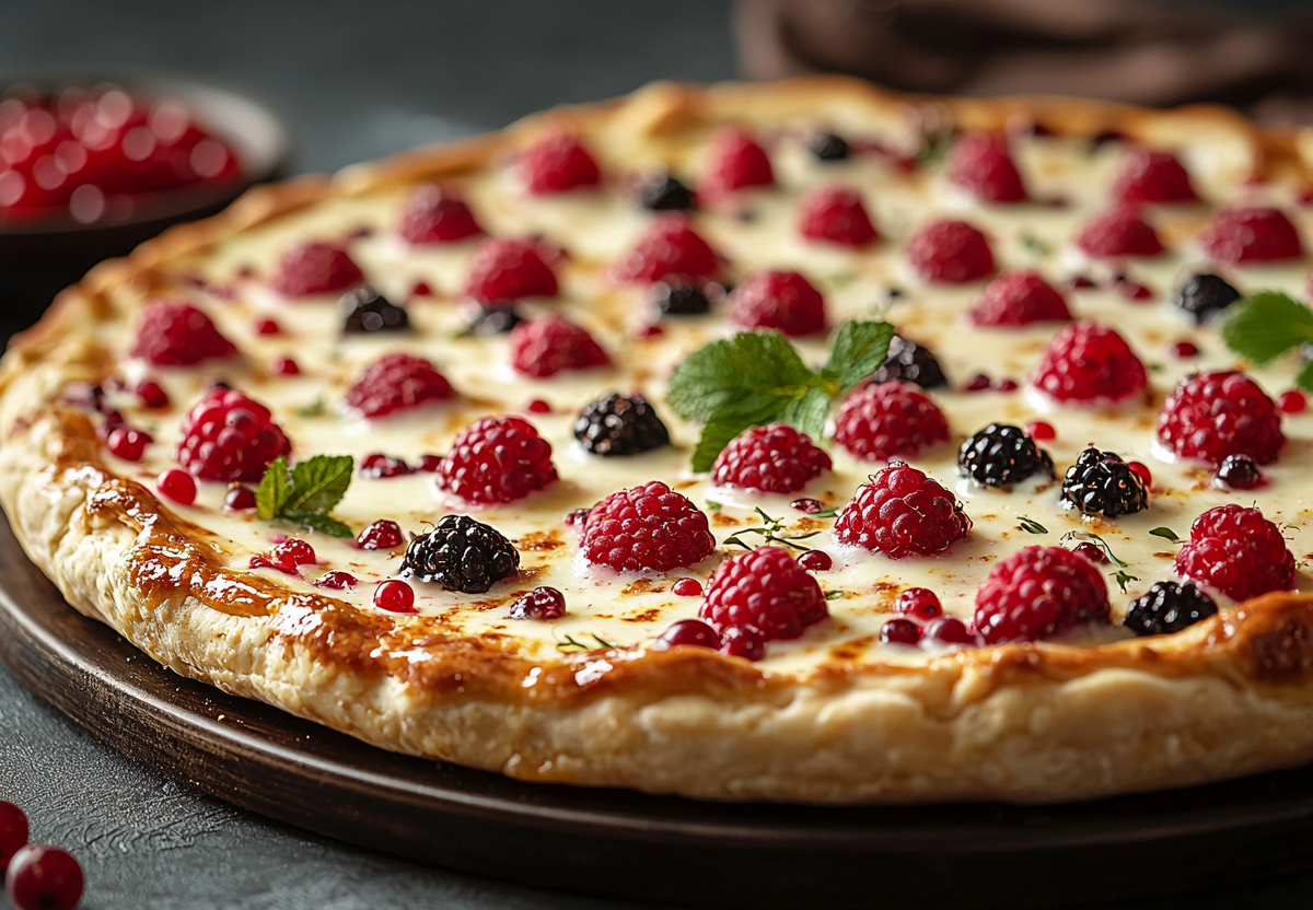 1. Тесто. Смешайте творог, яйца, муку и сахарозаменитель до однородности. Влажными руками сформируйте на пергаменте круг с бортиками (диаметр ~22 см). Вилкой сделайте проколы по всей поверхности.