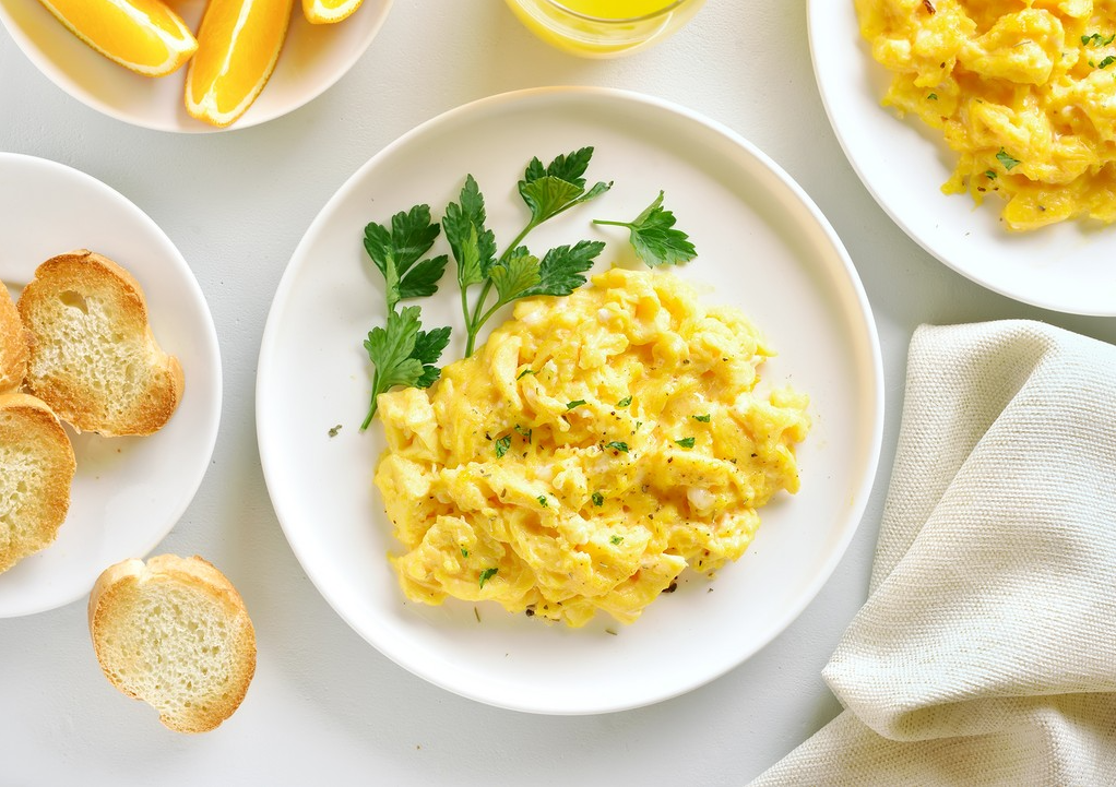 - Яичница-болтунья: 2 яйца взбейте с 1 ст. л. молока (1,5%), посолите. Обжарьте на антипригарной сковороде без масла (или с 1 ч. л. оливкового). Подавайте с зеленью.