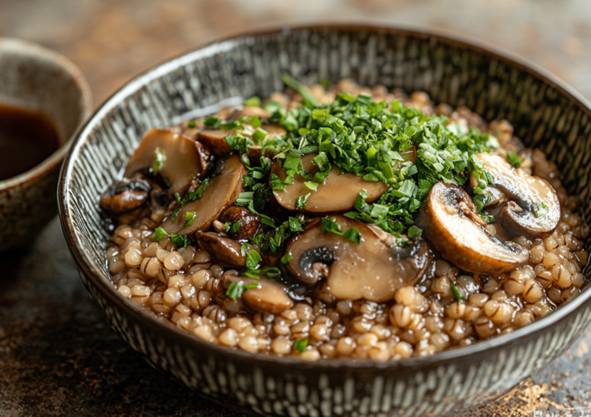 - Обжарьте лук, имбирь, чеснок, добавьте гречку, затем грибы.