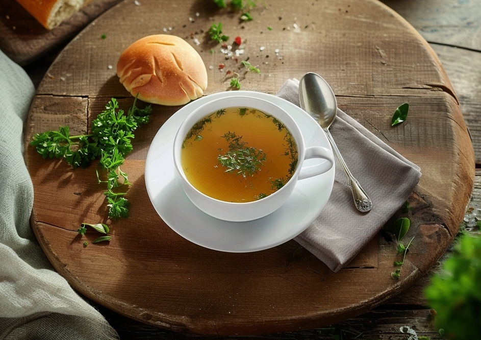 Традиционное русское блюдо — говяжий бульон с расстегаем — готово!