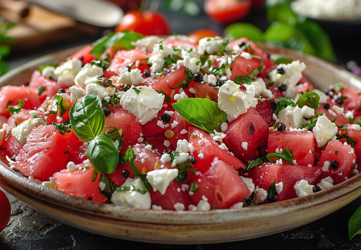 Салат с арбузом и фетой готов! Сразу же подавайте к столу.