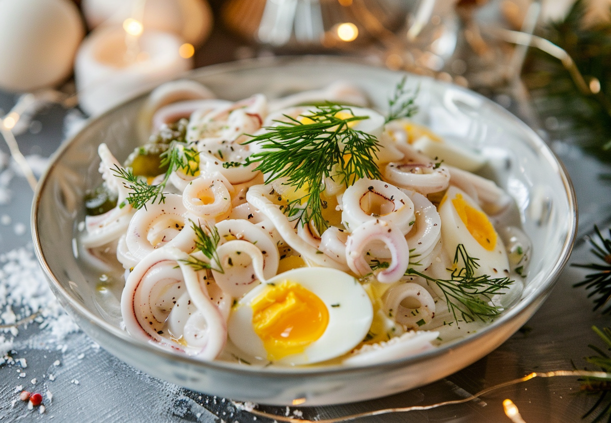 Праздничный салат с кальмарами готов!