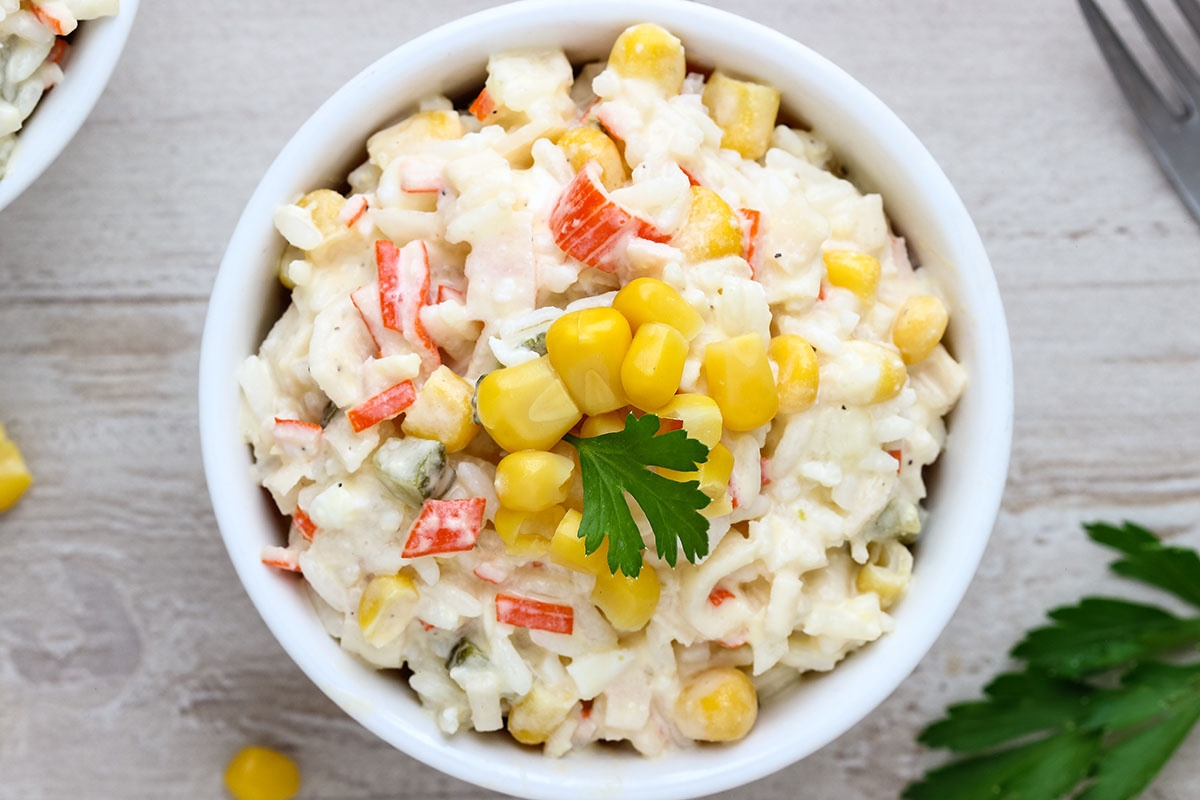 Классический салат с крабовыми палочками, рисом и кукурузой — легкая в приготовлении, сытная и нарядная закуска. Делимся традиционным рецептом угощения, которое украсит стол на Новый год или другой праздник.