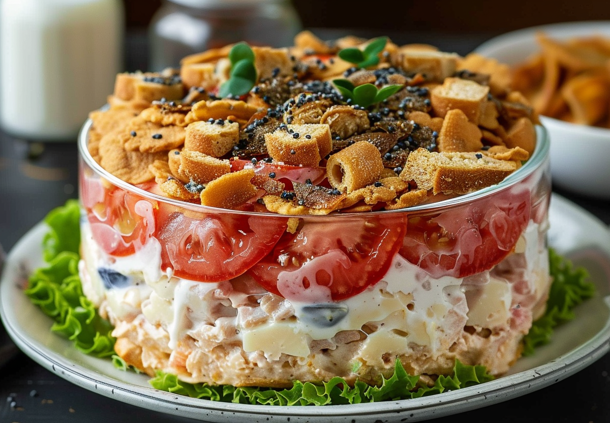 Ранее мы поделились рецептом слоеного салата «Ночь с курицей».