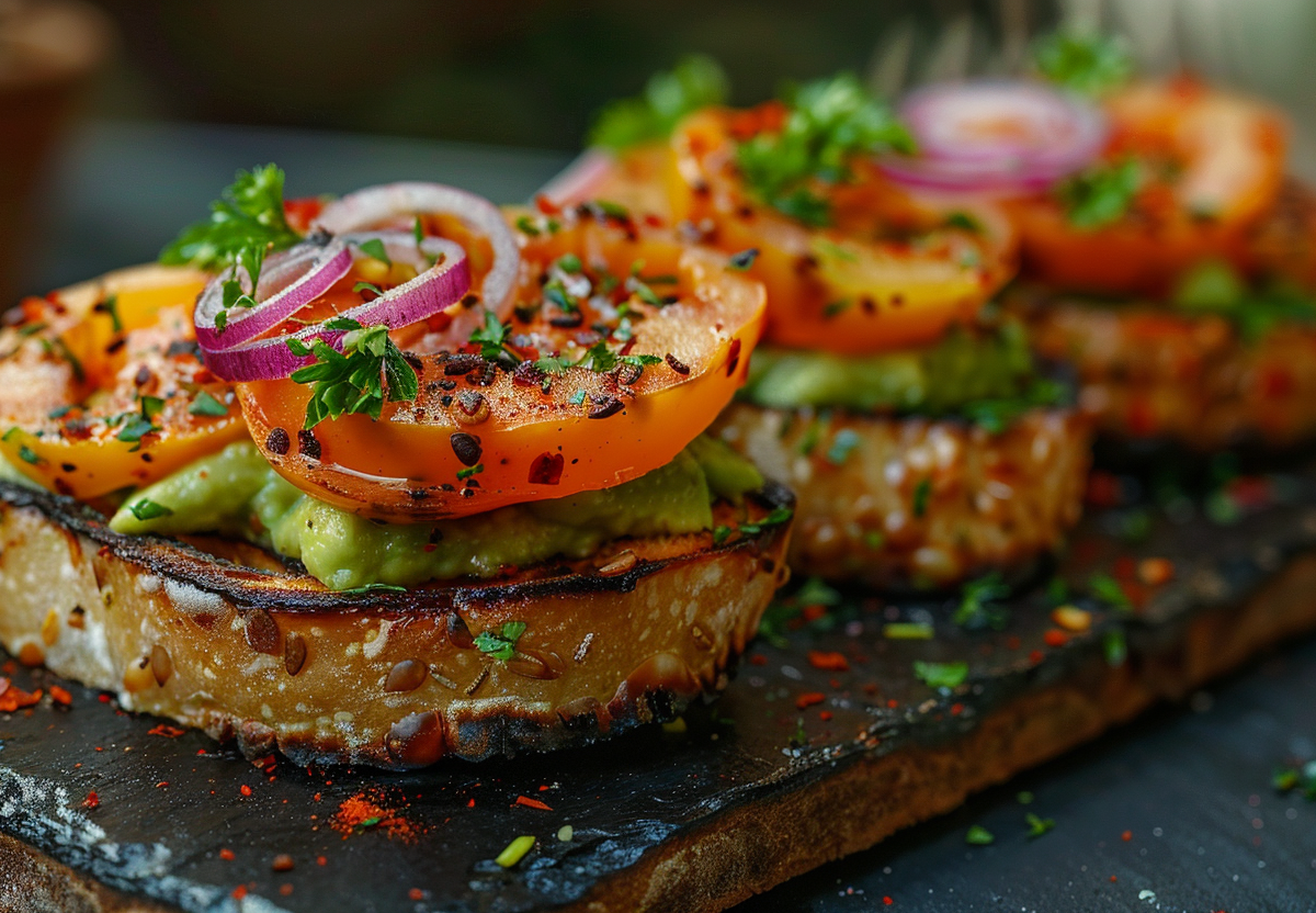 - Выложить пасту из авокадо на чиабатту, сверху добавляем томаты и красный лук.