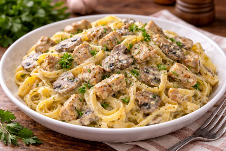 Эта паста — настоящая палочка-выручалочка, когда хочется чего-то сытного, нежного и очень вкусного. Сливочный соус, сочная курица и ароматные грибы делают блюдо таким аппетитным, что его просят готовить снова и снова. Готовится просто, из доступных продуктов, а выглядит и на вкус — как в хорошем кафе. Отличный вариант для ужина всей семьёй.