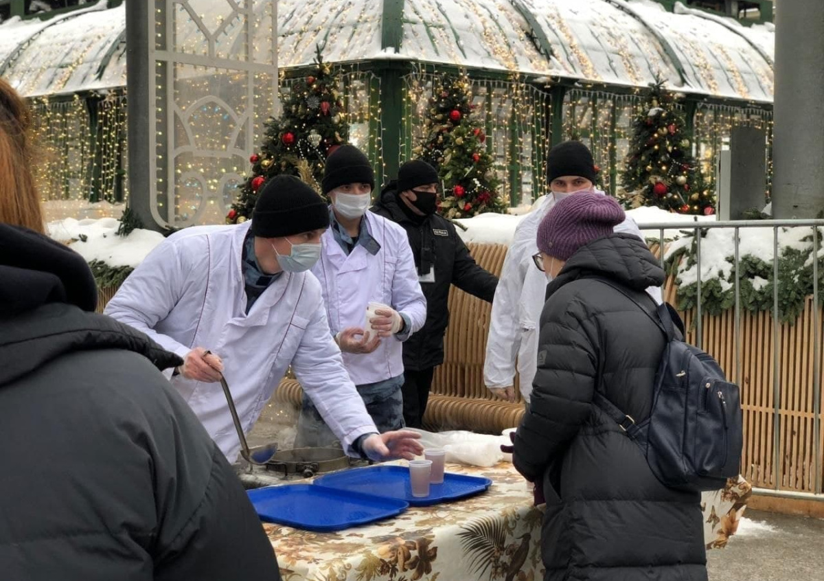 Росгвардейцы в центре Москвы начали раздавать всем желающим горячий чай и печенье.