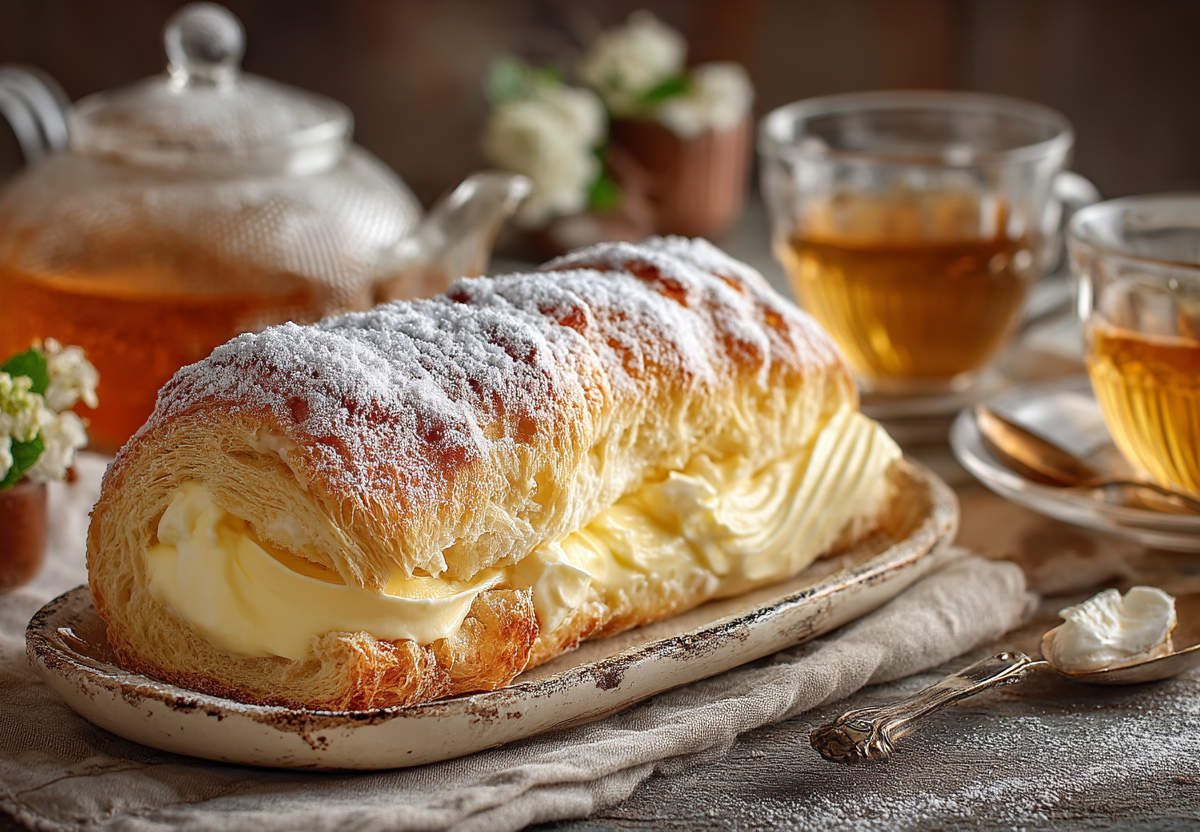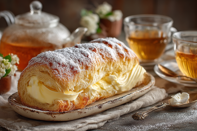 Рулет «Эклер» по этому упрощенному, домашнему рецепту, готовится из жидкого теста и со сливочным, заварным кремом. Основу не нужно отсаживать, а просто вылить на противень и запечь.