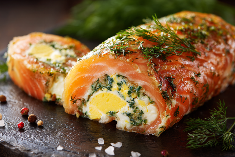 Рулет из горбуши с яйцом и зеленью — вкусный и горячим, и холодным! Секрет в красивой начинке!