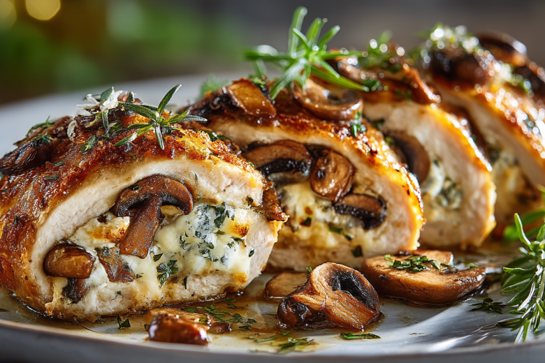 На отбитое филе выкладываю слой обжаренных грибов, затем сыр. Аккуратно сворачиваю рулетом, стараясь, чтобы начинка не выпадала.
