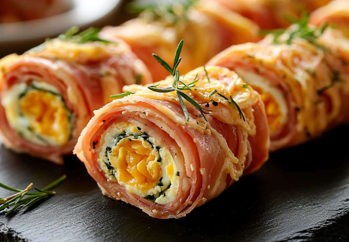Рулетики из ветчины с сырной начинкой. Изысканная закуска за 10 минут — просто, вкусно и эффектно! Идеально подходит для праздничного стола или как угощение для неожиданных гостей. Нежные ломтики ветчины, сочная начинка из сыра и вареных яиц, дополненная пикантным чесноком и майонезом, создадут настоящую феерию вкуса на вашем столе.