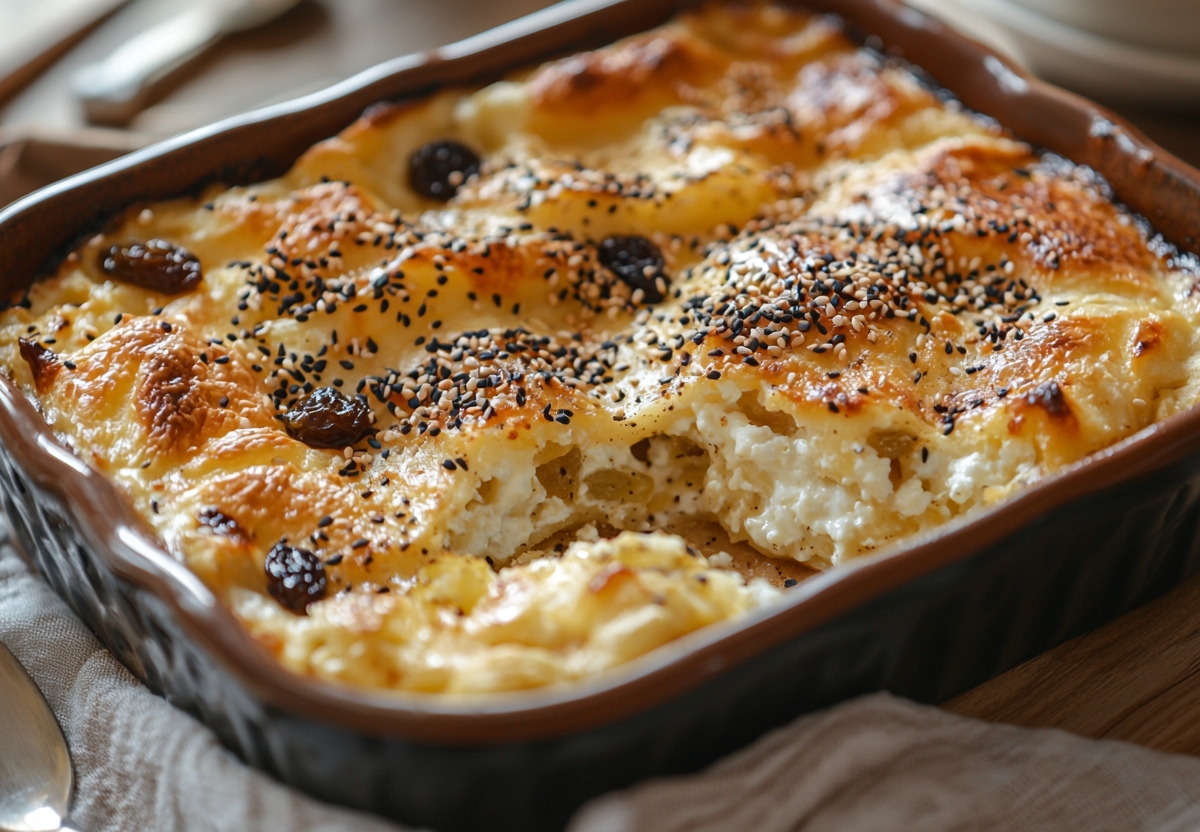 Как приготовить: изюм промойте в горячей воде, затем обсушите. В миске смешайте творог, яйца и подсластитель до однородности, добавьте изюм. Лаваш порвите руками на небольшие кусочки и вмешайте в творожную массу. Выложите смесь в смазанную форму, слегка утрамбуйте, посыпьте кунжутом. Запекайте в разогретой до 180 °C духовке 30–35 минут до румяности. Дайте немного остыть перед подачей.