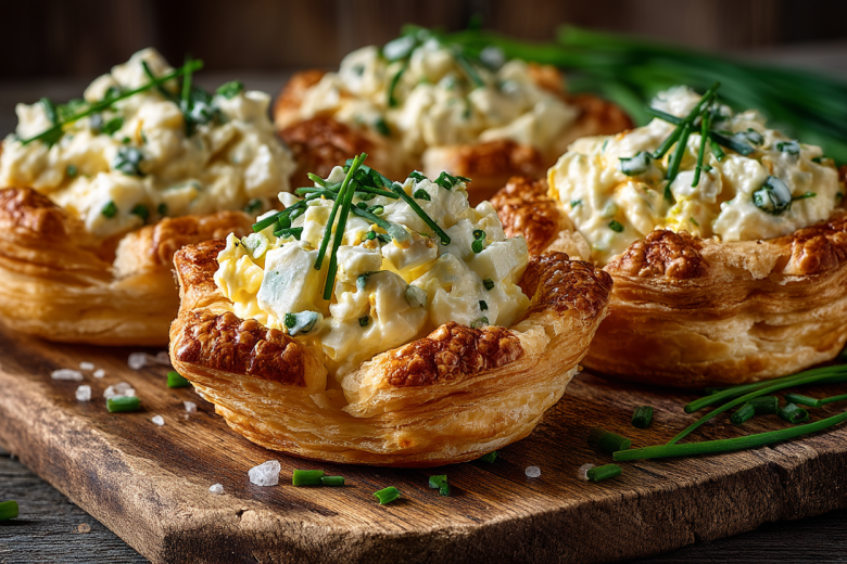 Эти изящные корзинки из слоеного теста с нежным салатом — прекрасная альтернатива классическим тарталеткам. Они сочетают в себе воздушную текстуру, насыщенный вкус и презентабельный вид, идеально подходят для любого повода — от утреннего кофе до фуршетного стола.