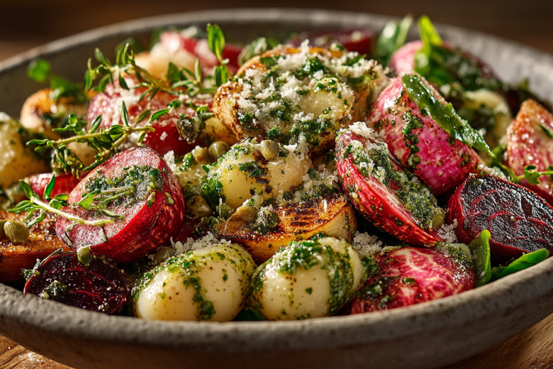 Запеченный редис — малоизвестный, но гениальный прием. Всего 15 минут в духовке — и его пикантная острота смягчается, уступая место карамельным нотам, которые идеально сочетаются с фасолью и пикантной заправкой.