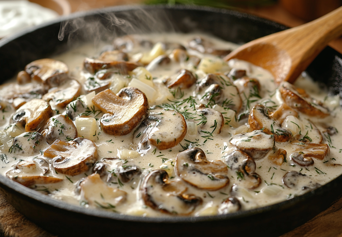 Обжарьте 500 г шампиньонов пластинками на сливочном масле до золотистого оттенка. Добавьте 1 измельченную луковицу и 2 зубчика чеснока — когда лук станет прозрачным, влейте 200 мл жирной сметаны. Приправьте черным перцем, щепоткой мускатного ореха и тушите под крышкой 10 минут на медленном огне. В конце добавьте горсть рубленого укропа — он раскроет вкус.