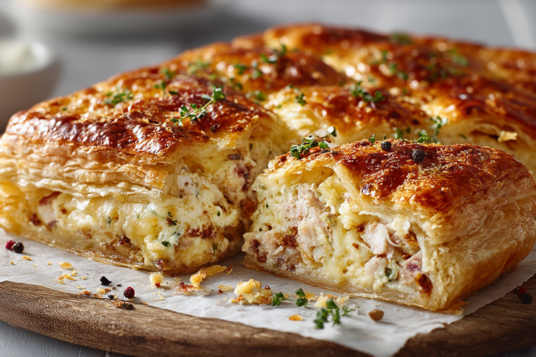 Сделайте сверху несколько небольших надрезов для выхода пара. Смажьте пирог взбитым яйцом для румяной корочки. Выпекайте в разогретой до 200°C духовке 25 минут до золотистого цвета.