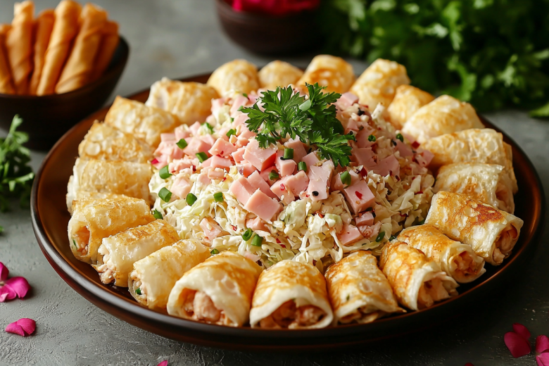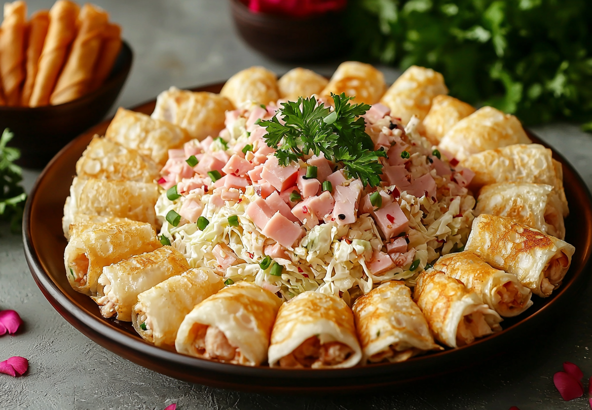 Вкус этого салата — это гармоничное сочетание нежности курицы и ветчины, хруста пекинской капусты, пикантной остроты моркови по-корейски и деликатного яичного вкуса. Майонез объединяет все компоненты в единую композицию, а яичные блинчики добавляют визуальной привлекательности и нежности. Салат получается сытным, но при этом легким и свежим.