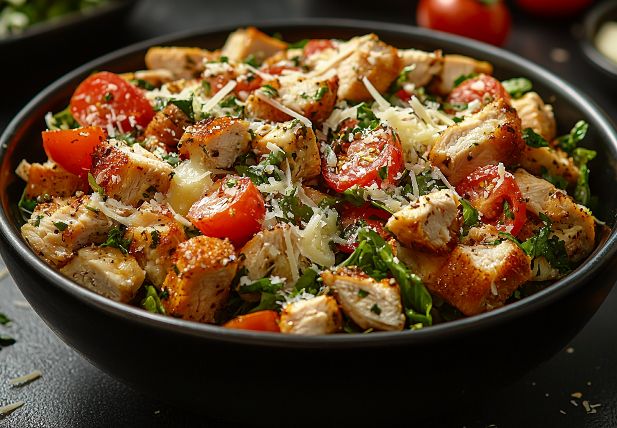 - Смешайте курицу, помидоры и сыр в миске.
