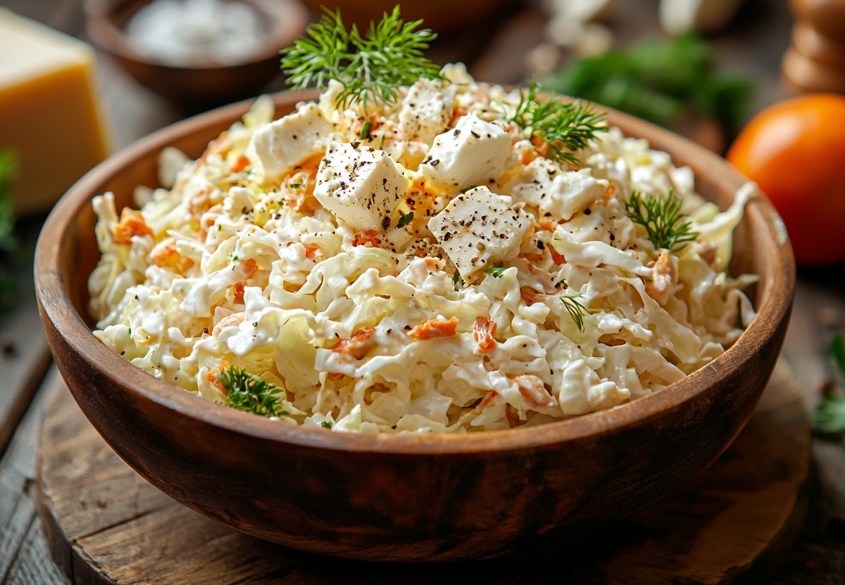 Вкус получается сбалансированным, свежим и пикантным: хрустящая капуста, нежная курица, солоноватая брынза и сливочные яйца в сочетании с кисло-сладкой и ароматной заправкой создают идеальную гармонию.