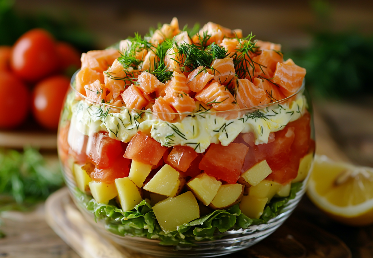 Салат «Бриз» с консервами из красной рыбы и картошкой! 4 продукта и без мороки! Этот слоеный салат сочетает нежную консервированную рыбу, свежие овощи и пикантную лимонно-укропную заправку. Идеальное блюдо для ужина или праздничного стола!