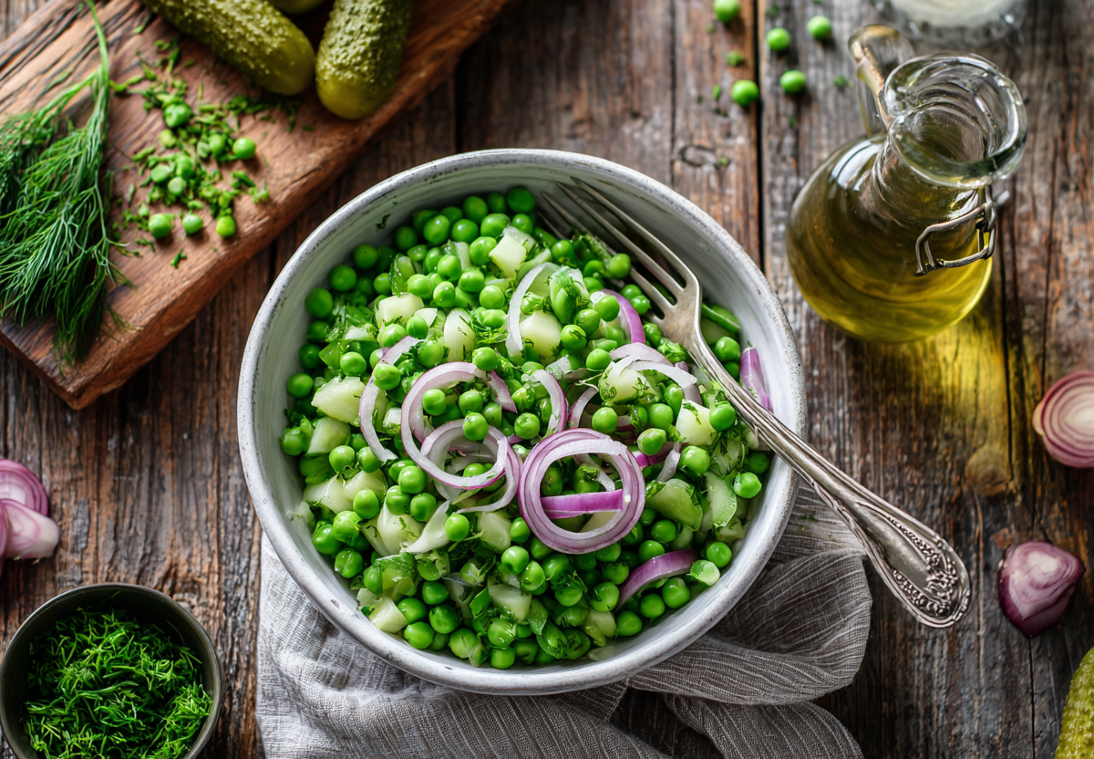 Когда в холодильнике есть баночка зеленого горошка, ужин уже наполовину готов. Этот простой салат собирается буквально за пару минут, а вкус получается ярким и домашним. Отличный вариант, когда не хочется долго стоять у плиты, но хочется чего-то свежего и сытного.