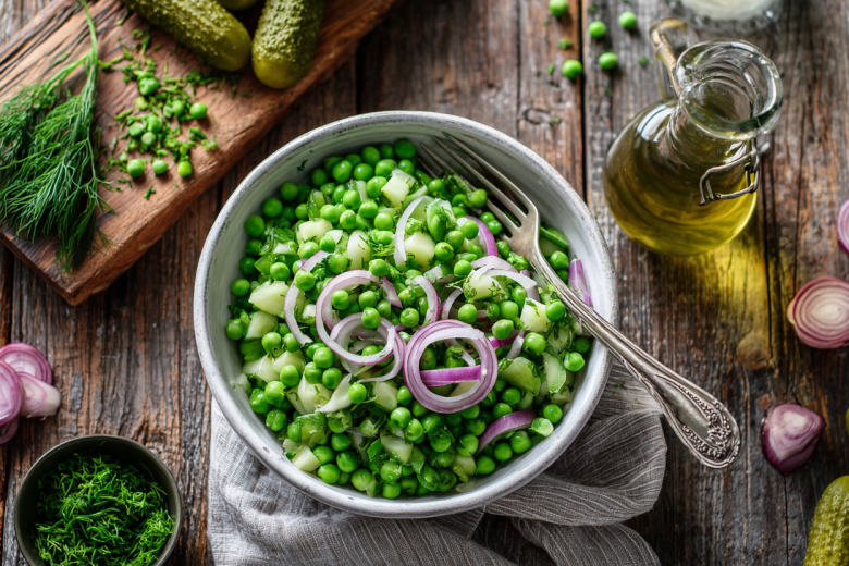 Соль, как правило, не нужна — ее хватает в огурцах и горошке. По желанию добавьте вареное яйцо или немного картофеля — салат станет еще сытнее и мягче. А щепотка перца или капля горчицы придадут пикантности.