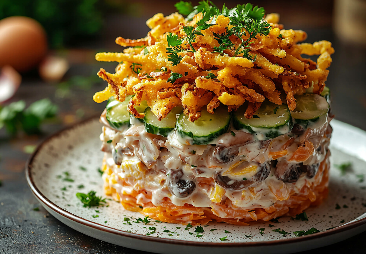 Салат «Царская охота» обошел по продажам в кулинариях оливье! Вкуснятина с картошкой фри. Этот салат — настоящий шедевр из простых продуктов! Нежная курица, хрустящие шампиньоны, соленые огурцы и картофель создают идеальный баланс текстур и ароматов. Сытный, праздничный и неизменно популярный на любом застолье.