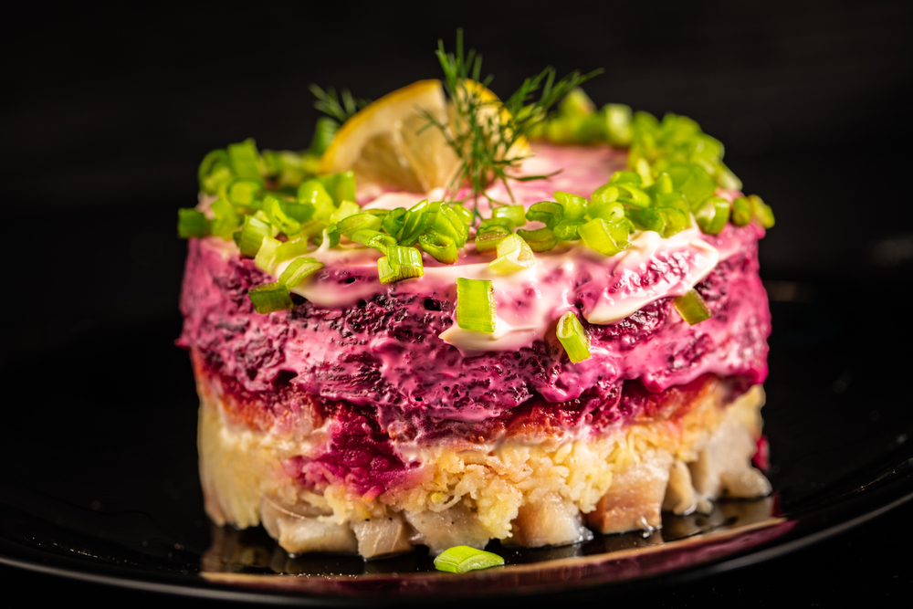 Как приготовить: овощи (картофель, морковь, свеклу) и яйца отварите до готовности, полностью остудите и очистите. Свеклу натрите на крупной терке и сбрызните небольшим количеством лимонного сока, чтобы сохранить яркий цвет. Картофель и морковь также натрите на крупной терке, яйца — на мелкой.