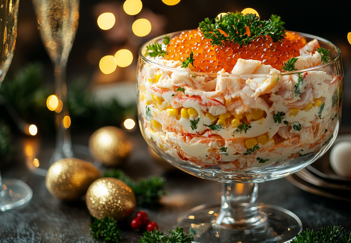 В отдельной миске смешайте 150 г творожного сыра и 2 зубчика чеснока, пропущенных через пресс, затем аккуратно распределите эту массу поверх кукурузы — этот слой делает салат особенно нежным. Далее натрите 3 вареных яйца и добавьте их следующим слоем, снова слегка промажьте майонезом. Завершающий слой — 150 г мелко нарезанных крабовых палочек, выложенных ровно и аккуратно. Сверху украсьте салат щедрой ложкой красной икры, можно добавить немного зелени по желанию. Перед подачей дайте ему настояться 20–30 минут — и получите салат, который точно разойдется первым.