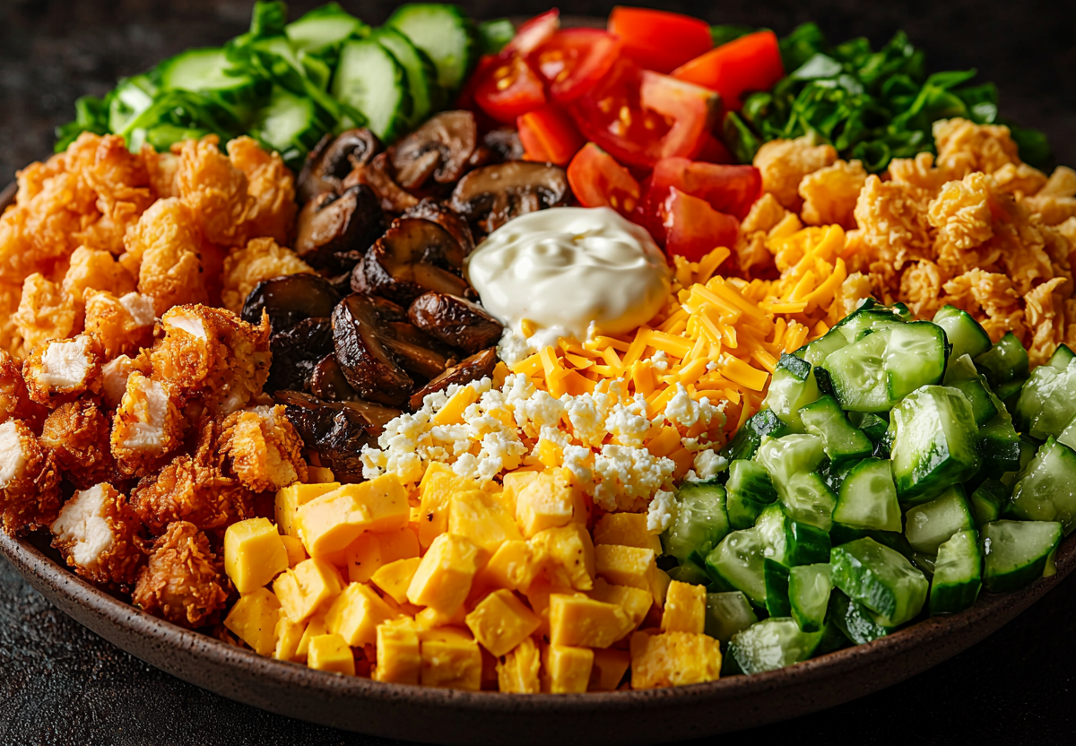 Салат «Деревенский» с хрустящей курочкой! Очень красивая подача горками и невероятный вкус! Этот салат сочетает в себе сочную курицу, хрустящие овощи и нежный сыр, а жареные шампиньоны придают ему особый аромат. Идеальное блюдо для семейного ужина или праздничного стола — просто, вкусно и по-домашнему уютно!