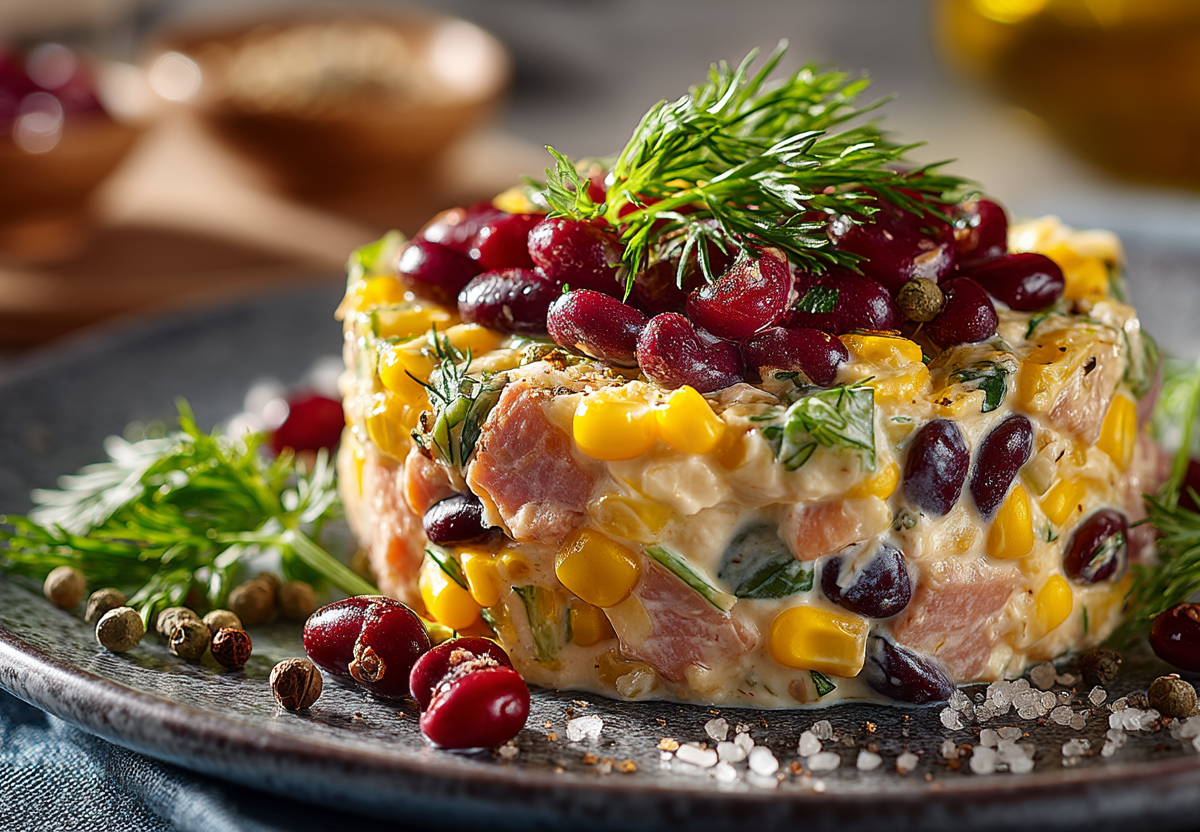Сладковатая кукуруза и изюм, соленая фасоль, пикантная ветчина, ароматный жареный лук и хрустящие чесночные сухарики создают настоящий калейдоскоп вкусов и текстур. Салат получается сладко-соленым.