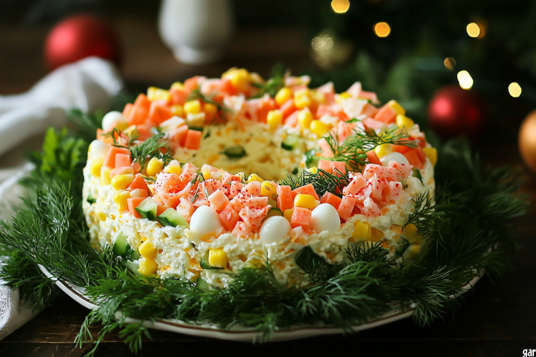Когда хочется создать на столе настоящий праздник, но нет времени на сложные блюда, салат «Гирлянда» становится идеальным решением. Этот яркий, жизнерадостный салат с нежными крабовыми палочками и яйцами не только вкусный, но и невероятно красивый. Его оригинальное украшение в виде новогодней гирлянды из овощей и зелени вызывает восторг и у детей, и у взрослых. Такой салат станет главным украшением вашего праздничного стола — простым в приготовлении, но эффектным в подаче.