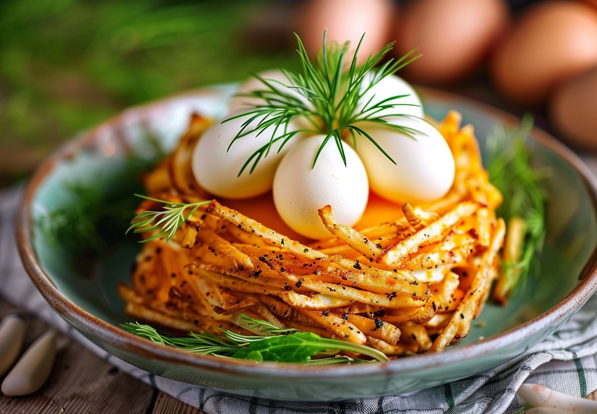 Выложите блюдо горкой на красивую тарелку, сверху сделайте углубление, формируя гнездо. По краям укладывайте жареный картофель, создавая эффект веточек. В центр гнезда выложите целые желтки или миниатюрные перепелиные яйца.