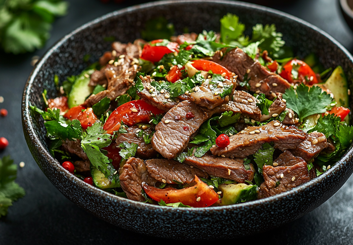 Говядину промораживаю 1–2 часа, чтобы было легче нарезать, и режу очень тонкими пластинами поперек волокон. Грибы муэр заливаю холодной водой на 20 минут для набухания, затем промываю и нарезаю полосками. Красный лук нарезаю тонкими полукольцами. В глубокой миске смешиваю уксусную эссенцию, сахар, соевый соус, измельченный чеснок, смесь перцев и аджику. Заливаю этим маринадом мясо, добавляю грибы и лук. Тщательно перемешиваю и оставляю мариноваться при комнатной температуре на 30–40 минут. В конце добавляю корейскую морковь и мелко нарезанную кинзу. Разогреваю подсолнечное масло до появления легкого дымка и заливаю им салат, быстро перемешивая. Подаю сразу же или даю настояться 10–15 минут в холодильнике.