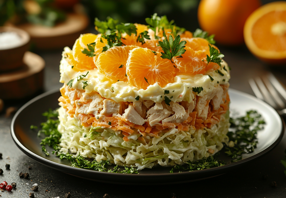 Вкус этого салата — это гармония контрастов: нежная копченая курица и сливочный сыр идеально сочетаются с хрустящей капустой, а сочные дольки апельсина добавляют освежающую цитрусовую сладость, которая балансирует насыщенность майонеза.