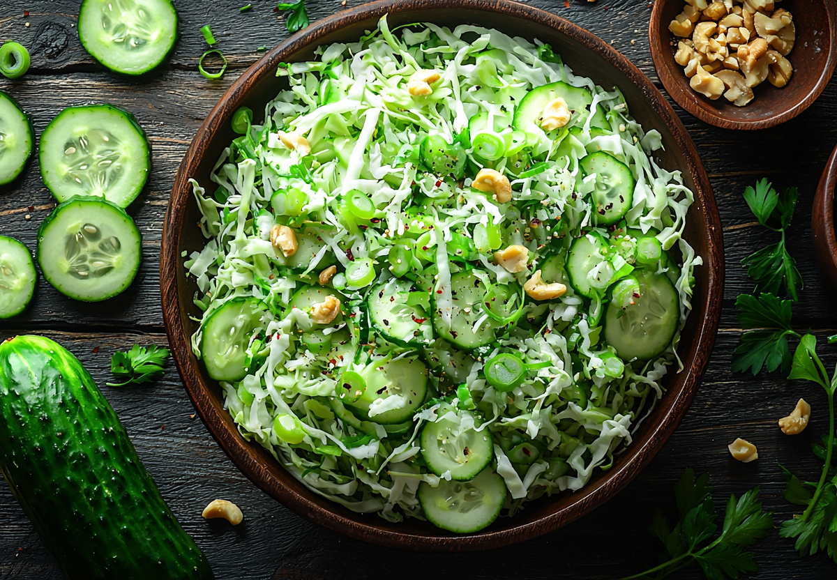Салат из молодой капусты с чумовой заправкой! Хит летнего сезона! Этот свежий и хрустящий салат — идеальное сочетание сочности капусты, огурцов и зелени. Нежная заправка на основе авокадо с грецкими орехами, мёдом и лимоном придаёт блюду приятную кремовость и лёгкую сладость.