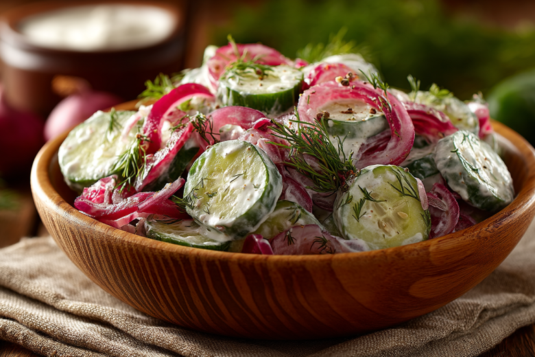 Сочные огурцы, маринованный красный лук и ароматный укроп в нежной сметане создают идеальный баланс вкусов.