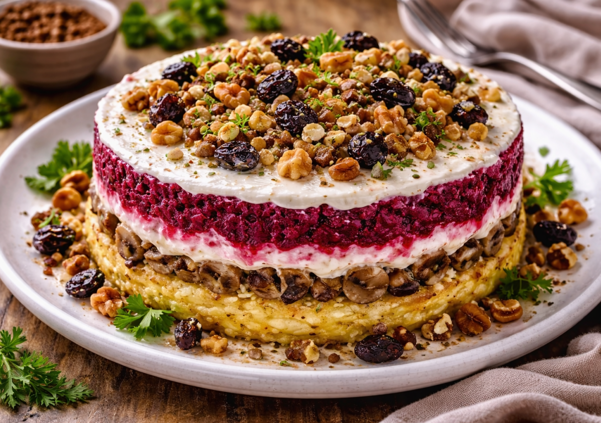 Свекла — один из самых доступных и полезных овощей, но этот салат раскрывает ее совсем по-новому. Минимум затрат, простые ингредиенты и очень достойный вкус — отличный вариант, когда хочется сэкономить, но подать что-то интересное. Салат «Амбассадор» получается сытным и сбалансированным: мягкая свекла и картофель, ароматные грибы с луком и приятная сладость сухофруктов. Хорошо подходит и для будней, и для праздничного стола.