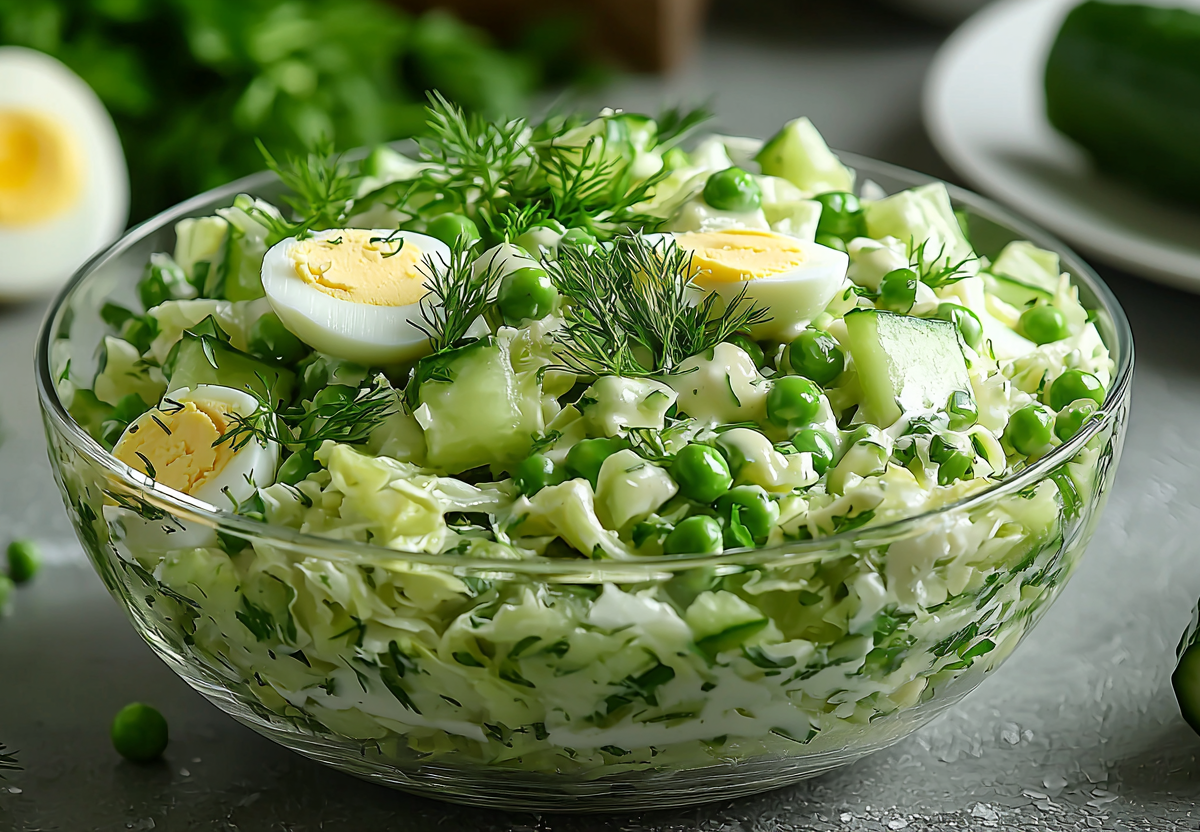 Приготовление: яйца сварите вкрутую, остудите под холодной водой, очистите и нарежьте некрупным кубиком. Добавьте к яйцам зеленый горошек, предварительно слив с него жидкость. Пекинскую капусту тонко нашинкуйте, огурец нарежьте соломкой или кубиками, всю зелень мелко порубите. В просторной салатнице соедините все подготовленные ингредиенты. Заправьте салат майонезом (для более легкого варианта можно использовать сметану или греческий йогурт), посолите по вкусу и аккуратно, но тщательно перемешайте. Подавайте сразу, чтобы сохранить максимум свежести и хруста.