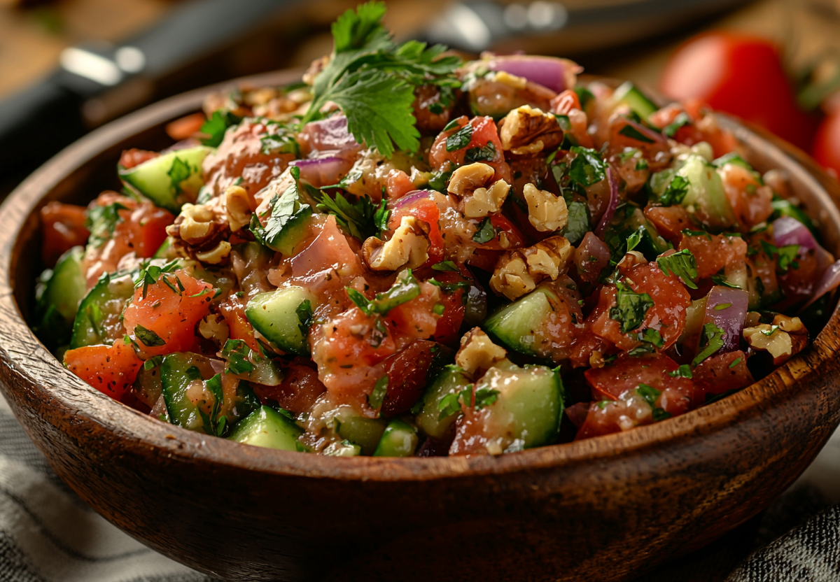 Салат к шашлыку из Грузии! Вкуснятина из овощей с бомбической заправкой. Яркий, ароматный и невероятно вкусный салат в лучших традициях кавказской кухни. Хрустящие овощи в пикантной ореховой заправке — это всегда беспроигрышный вариант для любого застолья.