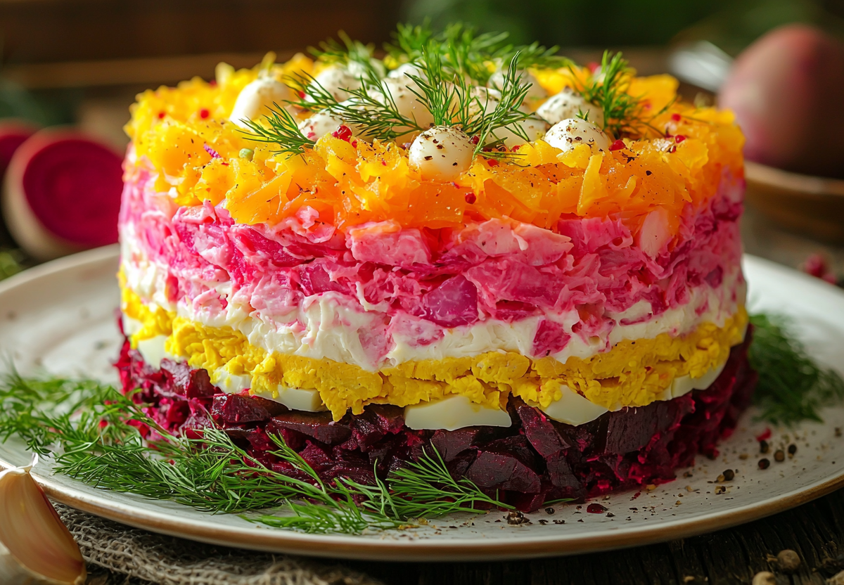- Уберите в холодильник на 1 час для пропитки. Украсьте укропом. Совет: для контраста добавьте слой обжаренных грецких орехов.
