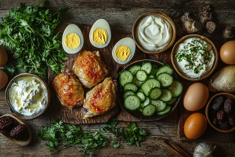 Для приготовления подготовьте шампиньоны — 500 г, куриные бедра — 4 шт., яйца — 4 шт., чернослив — 50 г, майонез и сметану — по 2 ст. л., чеснок — 2 зубчика, огурец — 2 шт., красный и белый лук — по 1 шт., яблочный уксус — 1 ст. л., а также соль и сахар по щепотке.