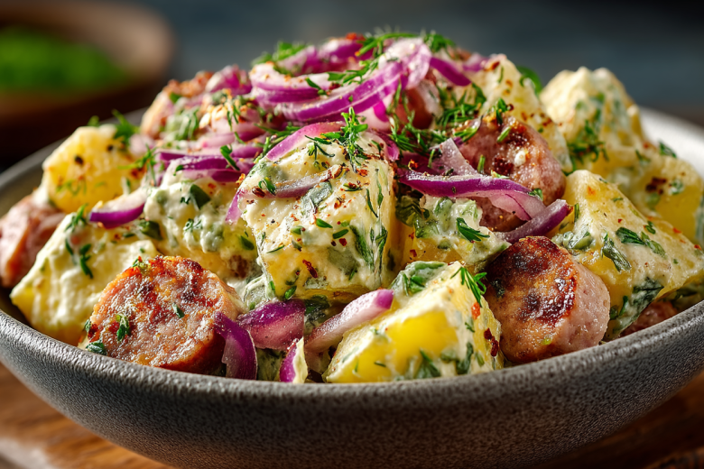 Вкус салата — это настоящий ансамбль ярких акцентов: нежная текстура картофеля, ароматный сервелат и хрустящие малосольные огурчики, которые объединяет пикантная заправка на основе горчицы.