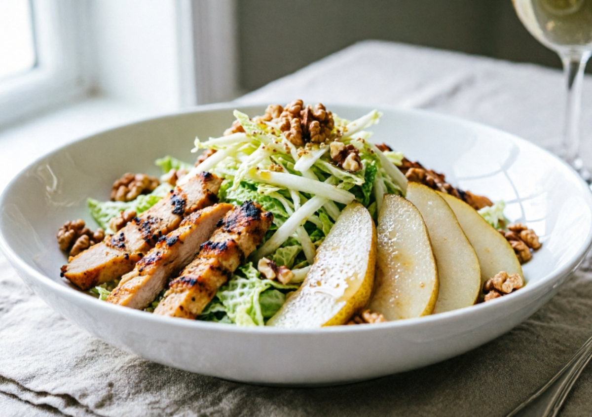 Если хочется подать на праздник что-то легкое, яркое и небанальное, этот салат станет настоящим спасением. Необычное сочетание копченой курицы, сладкой груши и орехов делает блюдо сочным, свежим и очень нарядным без тяжелого майонеза.