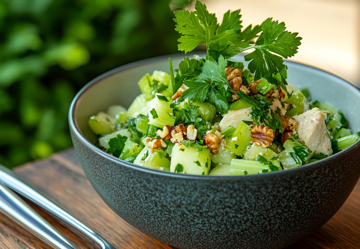 Салат «Легкая женщина» — обалденный низкокалорийный ужин. Это блюдо — настоящая симфония текстур: нежная курочка, хрустящие яблоки, пикантный сельдерей и ароматные орехи. Идеален для detox-ужина после тренировки! Всего 97 ккал на 100 г.