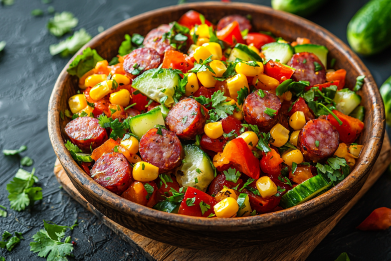 Салат «Мексика» без варки: взрыв красок и вкусов за 15 минут! Яркий, пикантный и невероятно сочный салат, который станет спасением, когда нужно быстро приготовить что-то вкусное. Сочетание копчёной колбасы, хрустящих овощей и сыра создаёт гармоничный ансамбль, напоминающий о мексиканских мотивах.