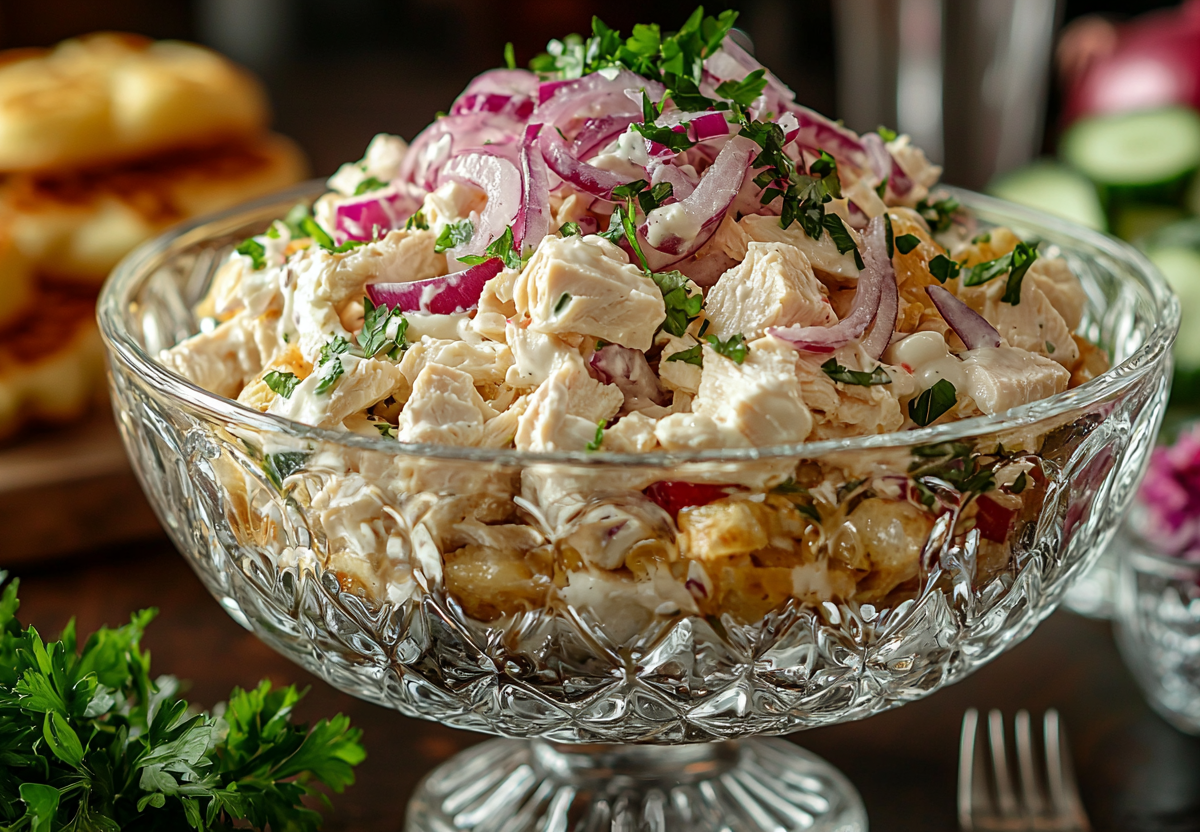 Вкус этого салата — это потрясающий микс нежной курицы, сладковатого жареного лука, пикантных хрустящих огурцов и сытных яичных блинчиков. Текстура нежная и хрустящая одновременно, а заправка майонезом связывает все компоненты в гармоничный, насыщенный и по-настоящему праздничный букет.