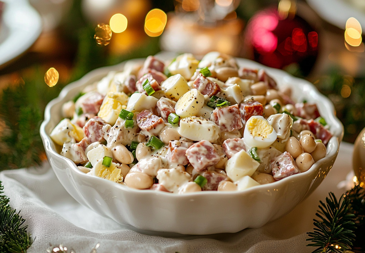 Ингредиенты: яйца (2 шт.), консервированная фасоль в собственном соку (1/2 банки), консервированные шампиньоны (1/2 банки), вареная или полукопченая колбаса (150–200 г), зеленый лук (небольшой пучок), майонез, соль, молотый черный перец.