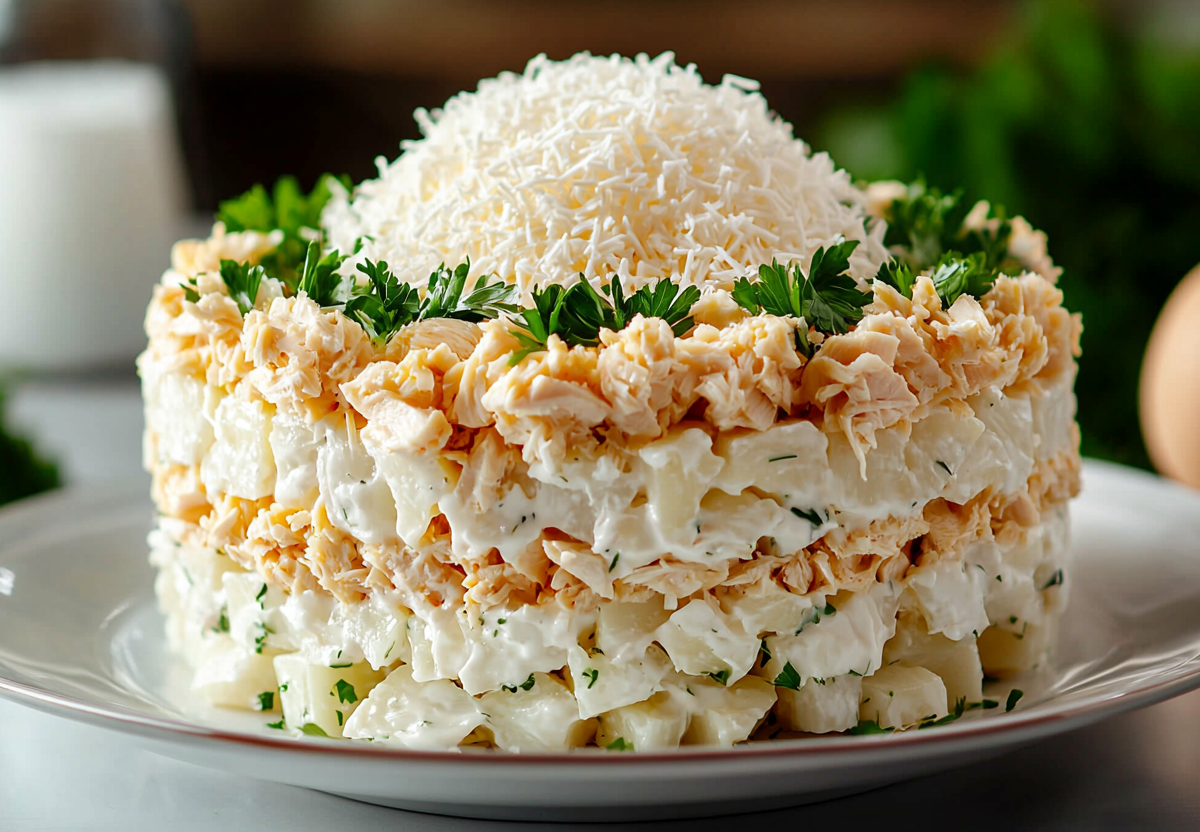 Салат «Невеста» — это нежное слоеное блюдо, которое полностью оправдывает свое название благодаря белоснежному виду и деликатному вкусу. Эта вкуснятина переплюнет оливье, крабовый и «шубу».